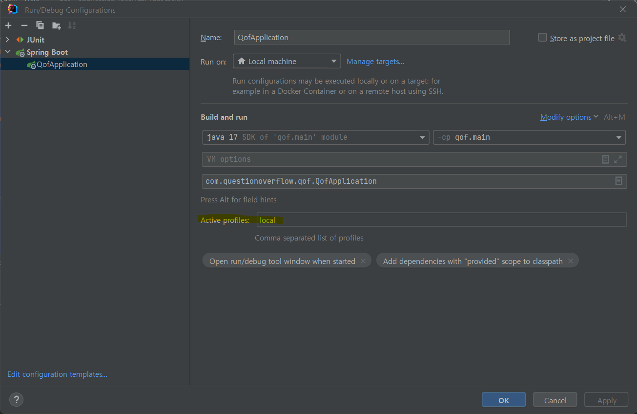 실행변수에서 설정을 넣을때 원하는 환경변수명을 설정하는데 그것이 없을때 local로 실행하겠다는 뜻으로 읽으면 된다.